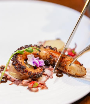 The Octopus course followed, featuring carpaccio, char-grilled tentacle, caper oil, roasted red pepper purée, microgreens, mustard potatoes, and black garlic. This dish was a testament to the restaurant’s commitment to pushing the boundaries of traditional flavours and textures.