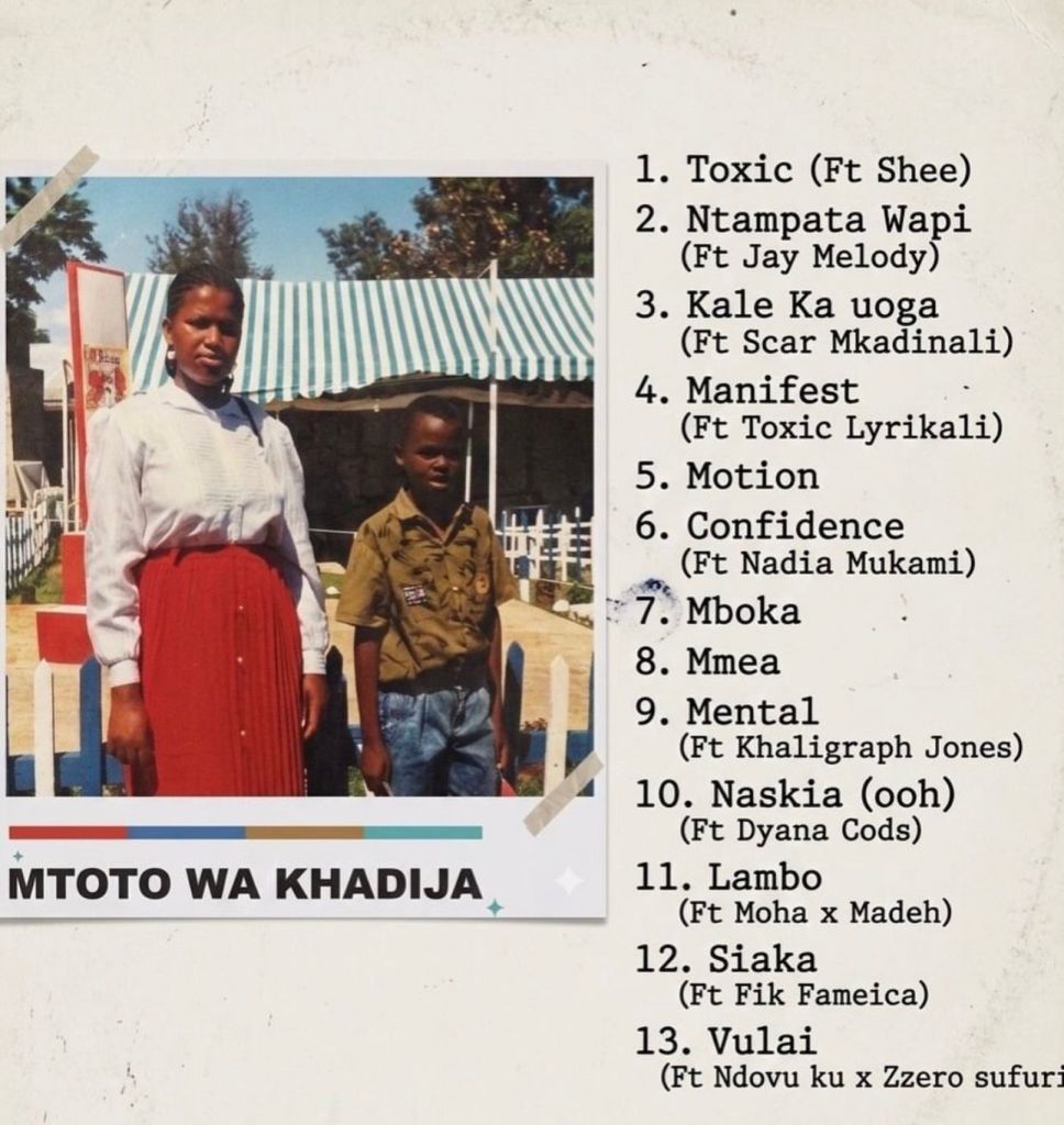 The album’s 13-track listing tells the story of an artist pulling from every corner of his world. It opens with Toxic featuring Shee, moves through Ntampata Wapi with Jay Melody, Kale Ka Uoga with Scar Mkadinali and Manifest with Toxic Lyrikali. Mboka and Mmea sit at the heart of the project before Mental, a standout collaboration with Khaligraph Jones. The album also features Naskia (Ooh) with Dyana Cods, Lambo with Moha and Madeh, Siaka with Fik Fameic and closes with Vulai alongside Ndovu Kuu and Zzero Sufuri.